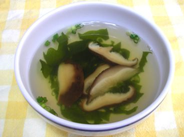 Bもどした椎茸と@のもどし汁(約400cc。足りなそうであれば水を足す)、もどしたカットわかめを火にかけ沸騰させる。沸騰したら弱火にして、だしの素と塩を入れて味を調え、わけぎを入れる。
