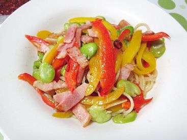 C茹であがったパスタをBに入れ、茹で汁50cc、パプリカ、空豆を加える。